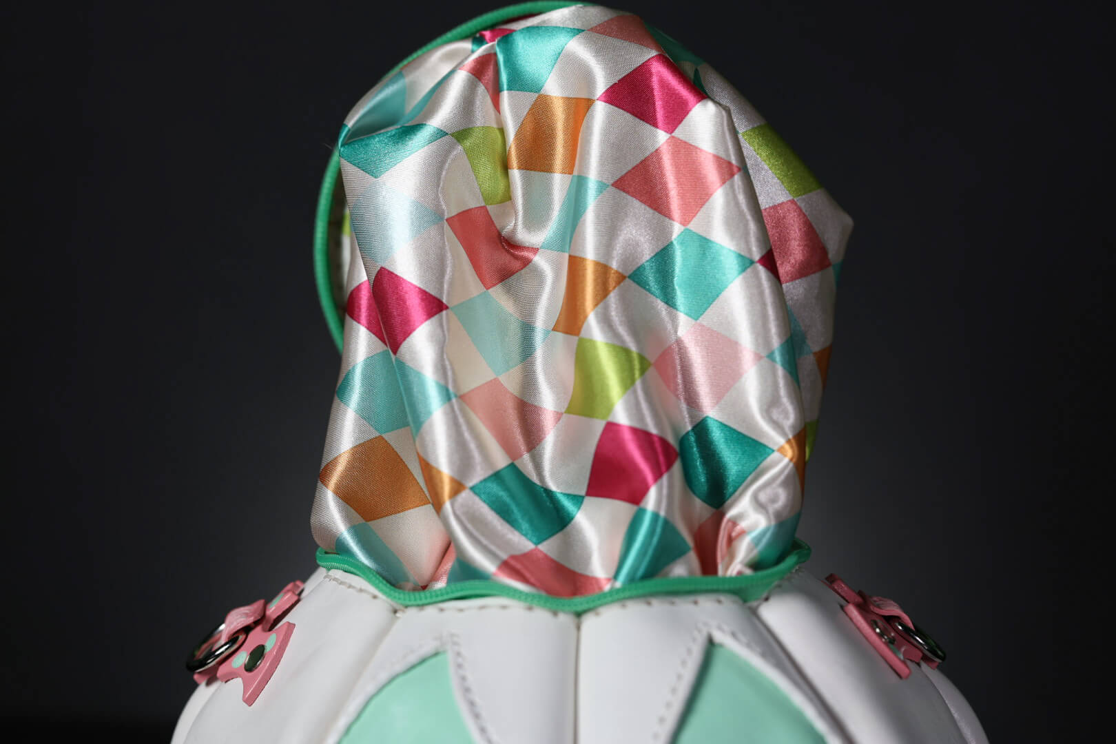 This pumpkin bag is made by hand from premium-grade full-grain leather. It is painted and stitched by hand and features a satin lining with a multi-colored harlequin print. This bag comes with an adjustable leather crossbody strap.