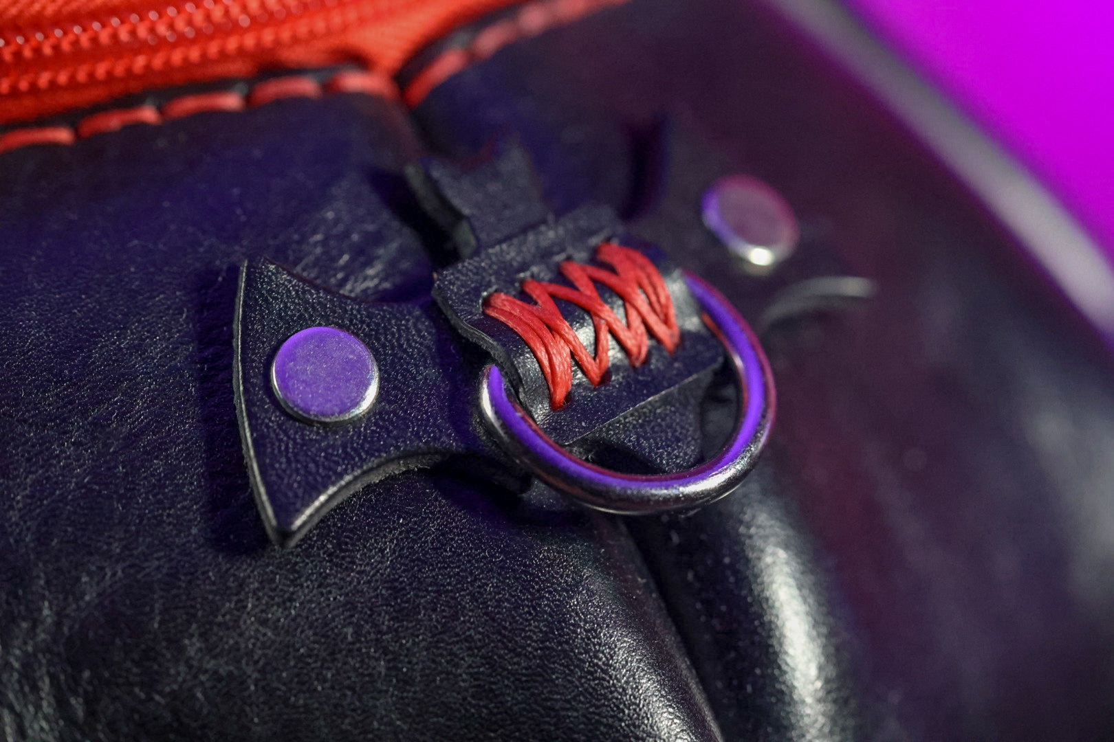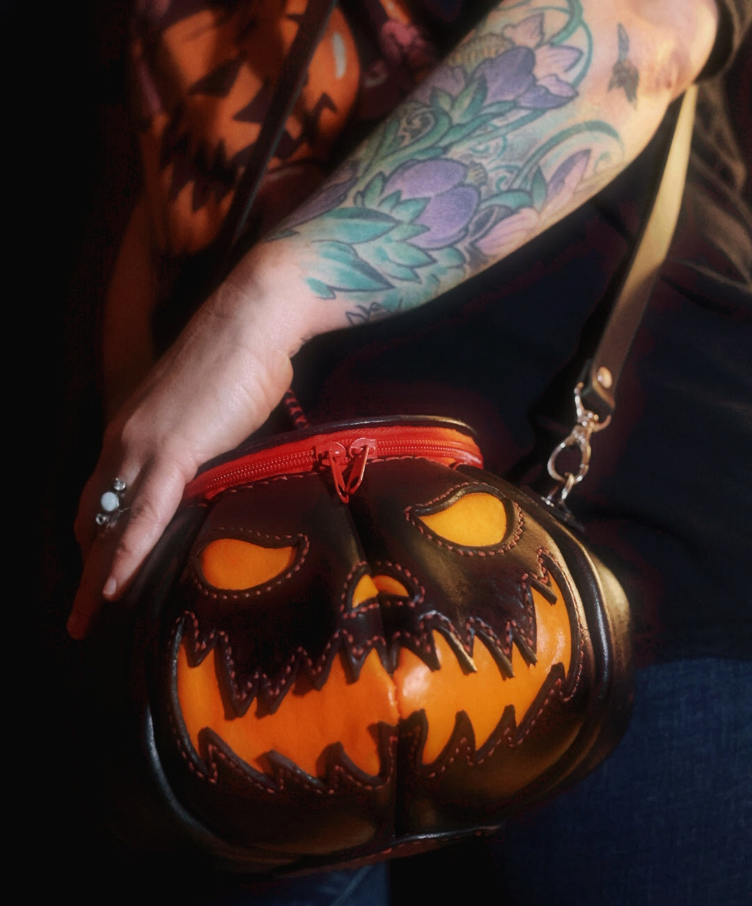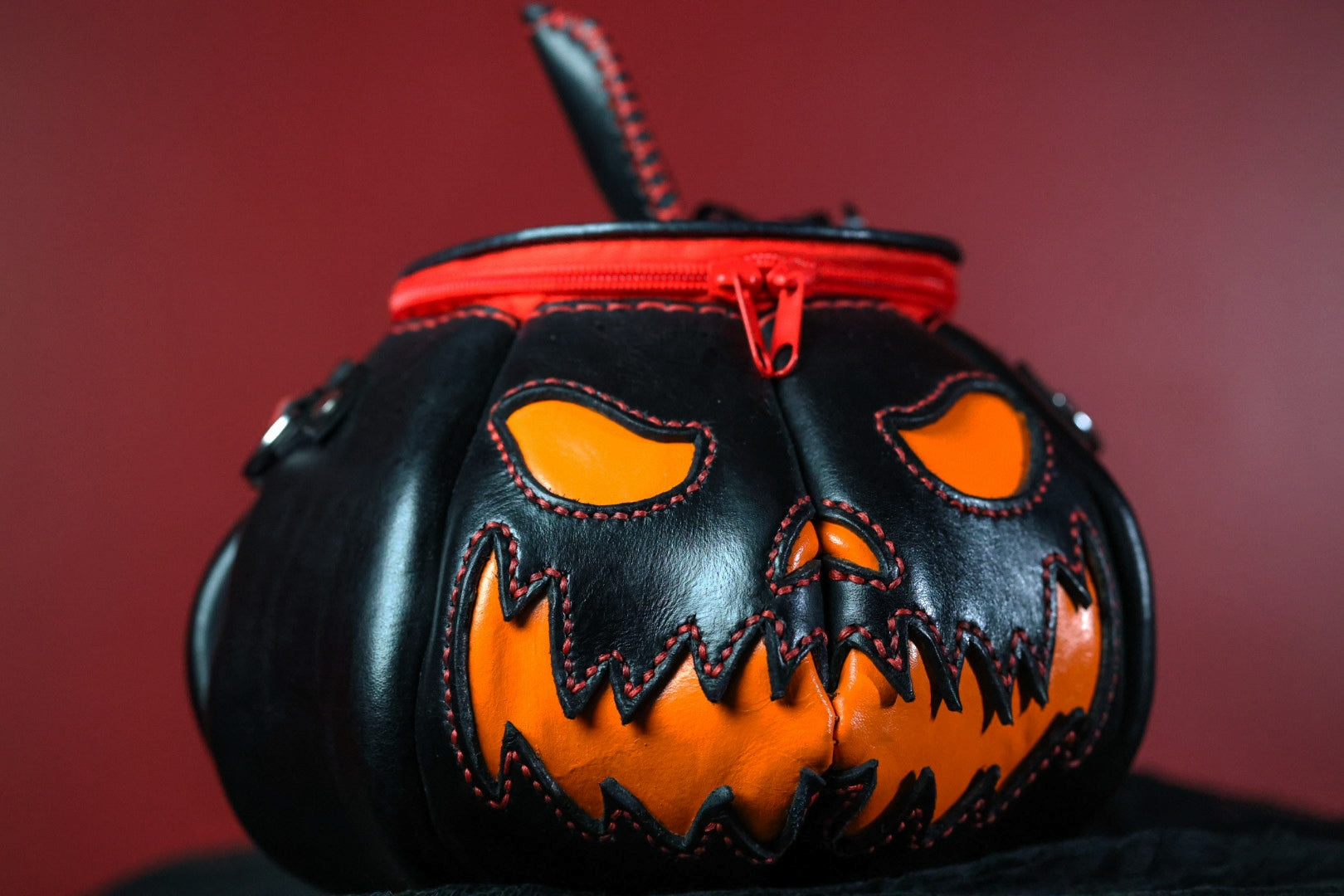 These handmade leather pumpkin bags are made by hand from premium-grade full-grain leather. They are dyed black with orange, hand-painted face details and red stitch. The satin lining features a Halloween candy print. This bag comes with an adjustable leather crossbody strap.