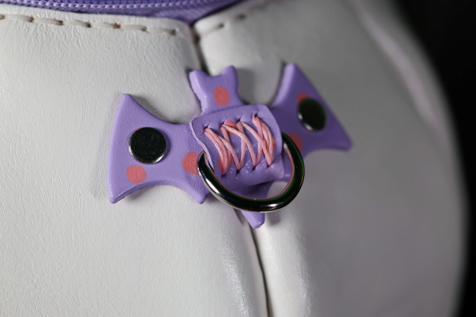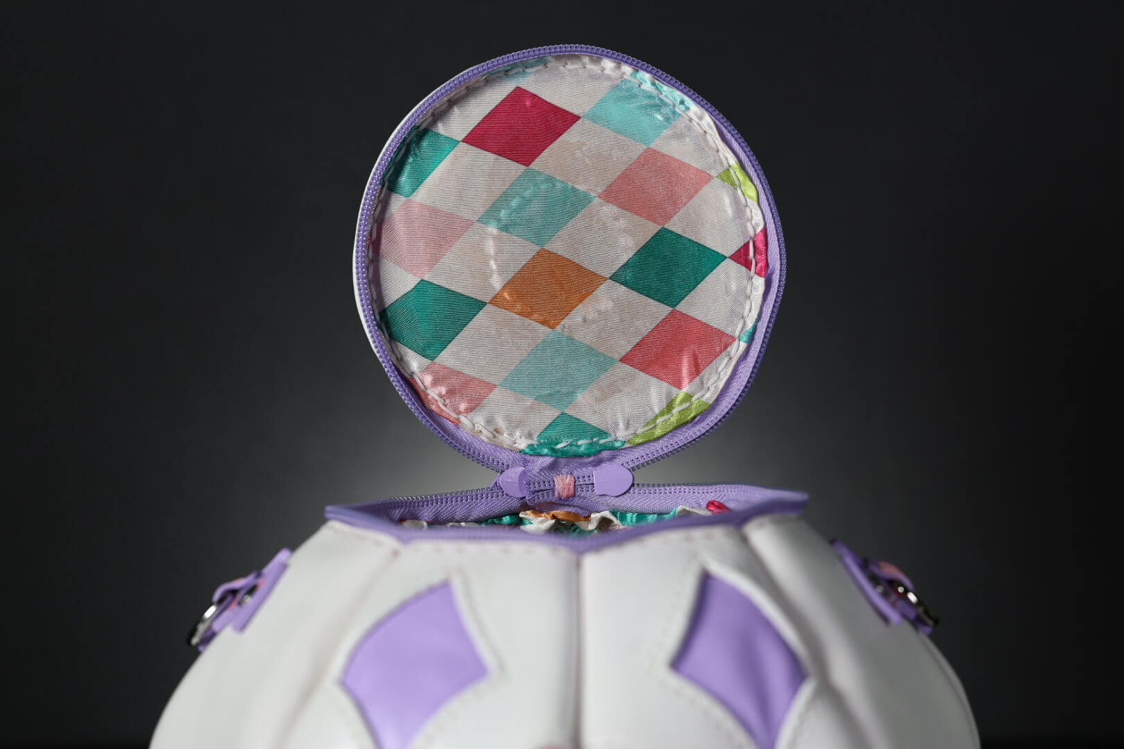 Made to order! These handmade leather pumpkin bags are made by hand from premium-grade full-grain leather. They are hand-painted white with pink & purple face details. The satin lining features a multi-colored harlequin print. This bag comes with an adjustable leather crossbody strap.