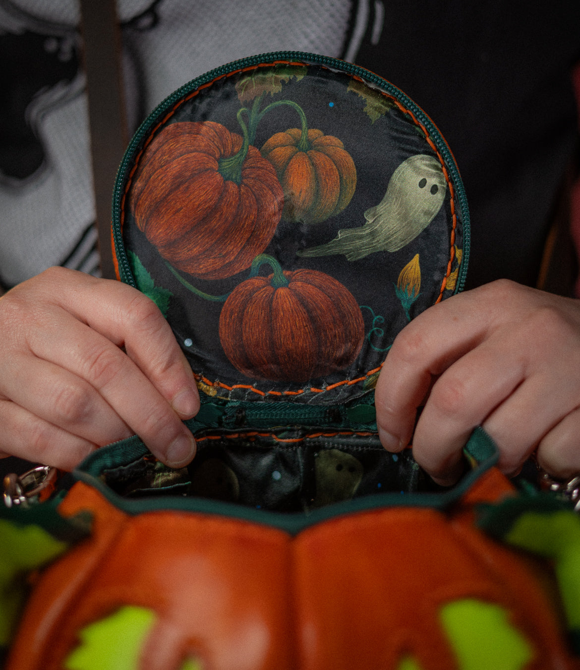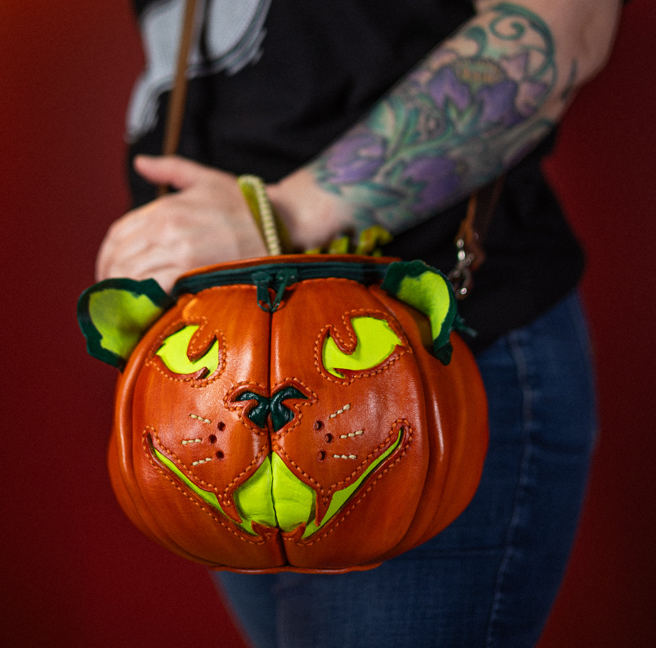 This handmade leather pumpkin bag was made by hand from premium-grade full-grain leather. It is dyed orange with light and dark green hand-painted accents. The satin lining features two interior pockets and a spooky autumnal print. This bag comes with a leather crossbody strap, a leather handle strap, or both!