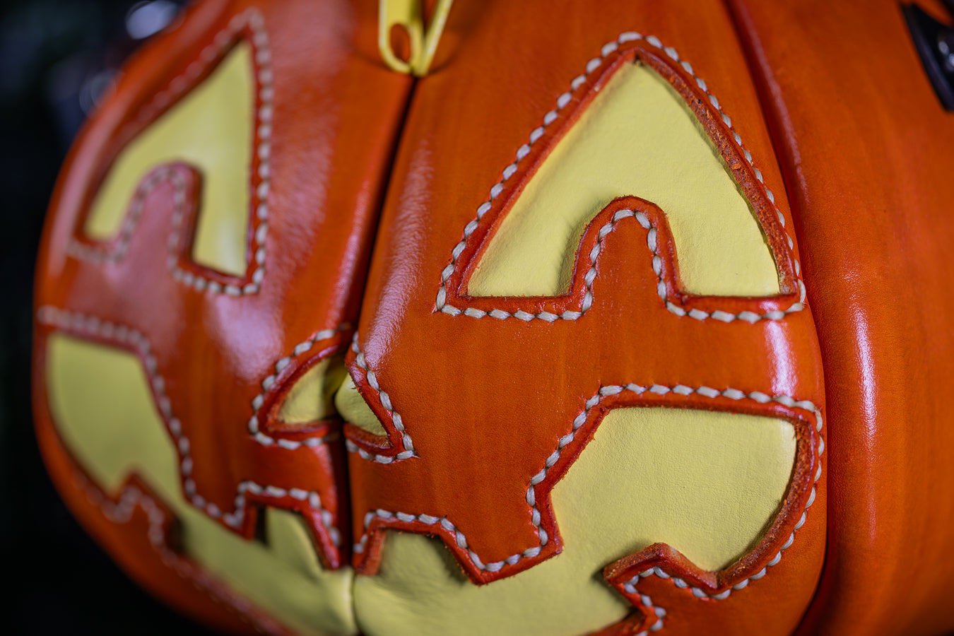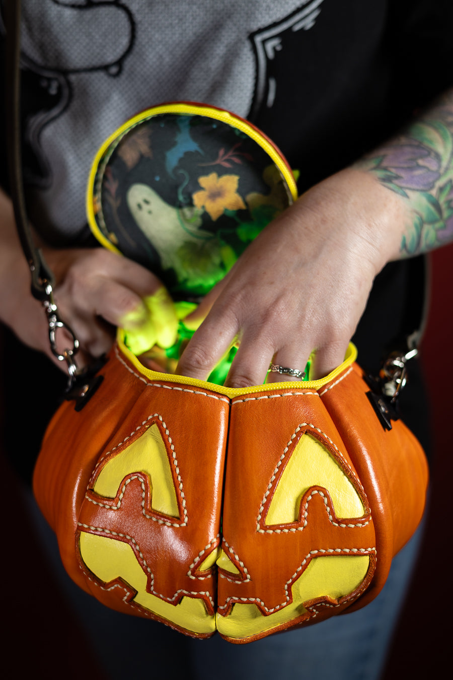 Made to order! These handmade leather pumpkin bags are made by hand from premium-grade full-grain leather. They are dyed orange with pale yellow hand-painted face details. The satin lining features a whimsical, Halloween-style print. This bag comes with an adjustable leather crossbody strap.